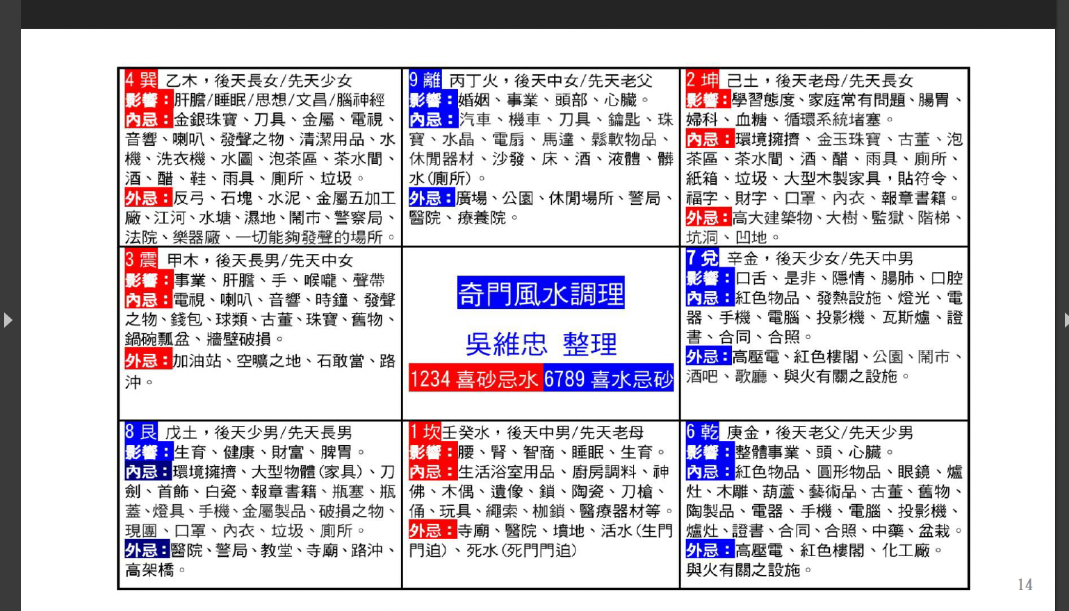 - 陽宅調理(八卦忌宜,如巽宮忌金屬)
